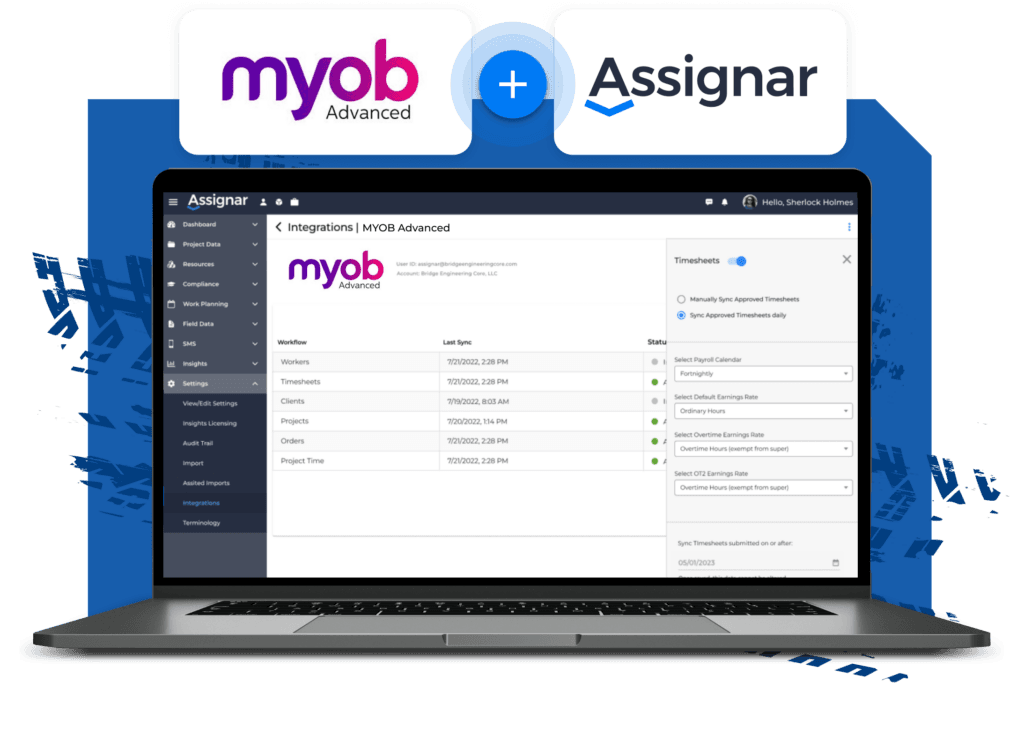 Assignar will pull over your job data from MYOB Advanced, and automatically sync back timesheet data at the interval you choose.