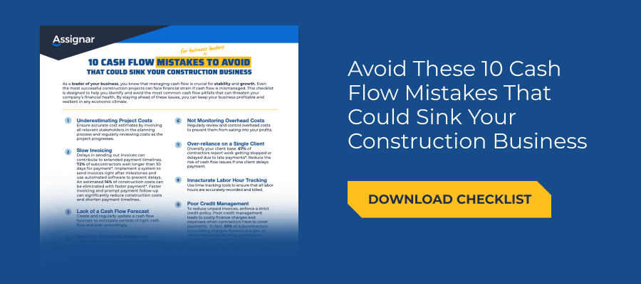 Ready to dive deeper into cash flow management for your construction business? Download Assignar’s free checklist on “10 Cash Flow Mistakes to Avoid for Business Leaders” and learn how to avoid the pitfalls that can hurt your bottom line. It’s a must-read for contractors looking to keep their cash flow steady and their businesses growing!